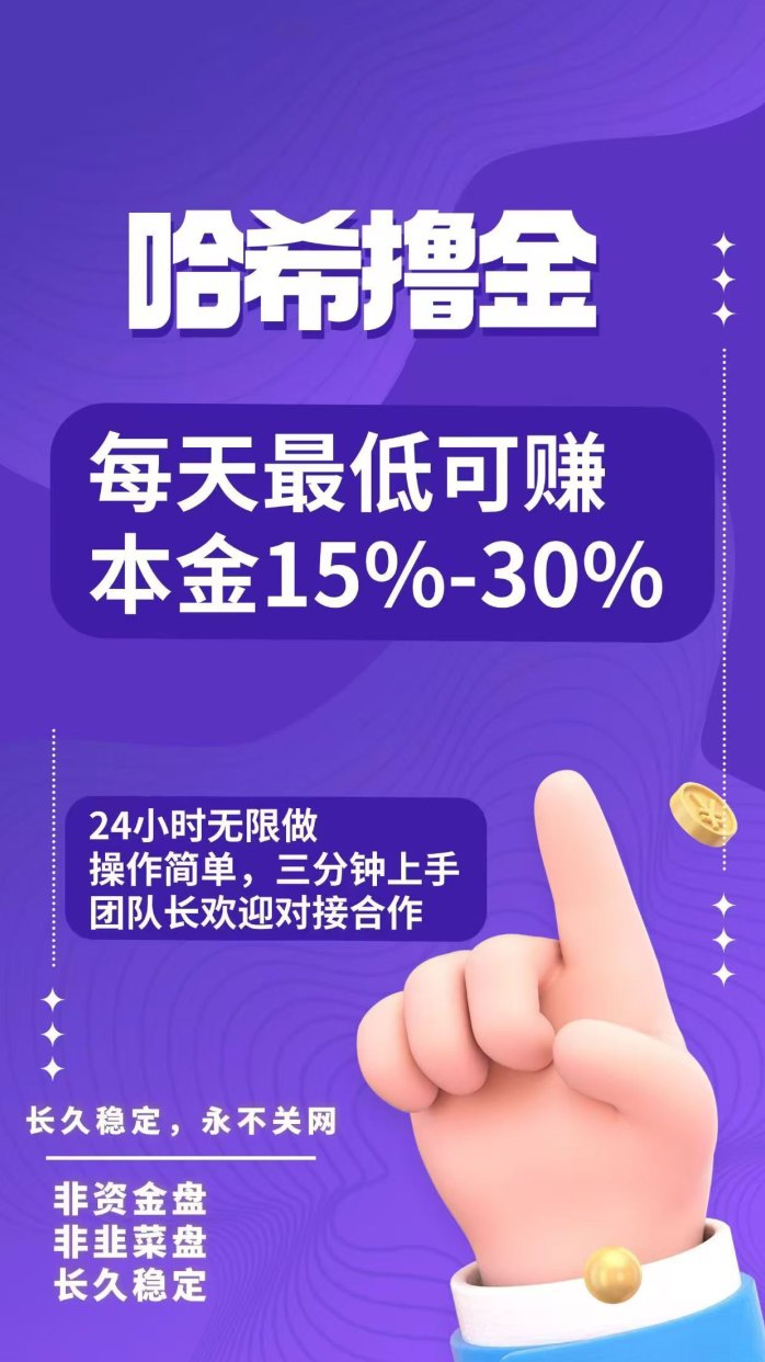 - 哈希撸金,一天最低10%-30%,24小时打金无限制,几分钟学会操作,收溢无上限!